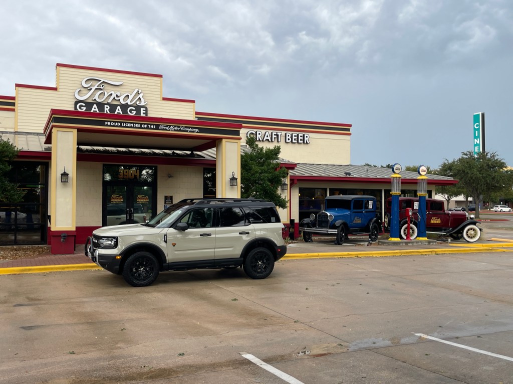The first real drive in the Bronco Sport was motivated by one thing: hunger. We headed straight to Ford’s Garage, and it honestly felt perfect rolling up in a Bronco to a place that’s built around the brand. The exterior design grabbed us before we even parked, but the inside was the real surprise. It was cool in a way that felt intentional, with a nostalgic, on-brand vibe that made it feel like part restaurant and part tribute to the company’s history.